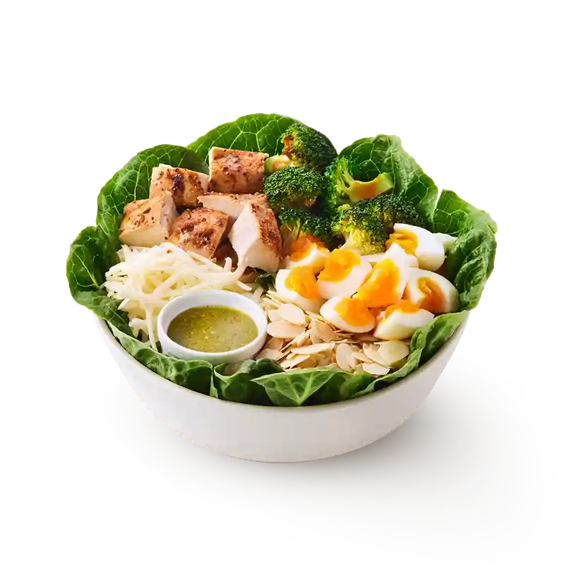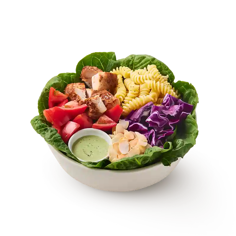 レタス、チキン、トマト、シラントロ、アボカドを合わせたチキンタコスのような味わい。ドレッシングは雑穀米と相性の良いキャロットチリビネグレットで、ピリッと甘辛いボウル。(押し麦 (大麦)を含む)