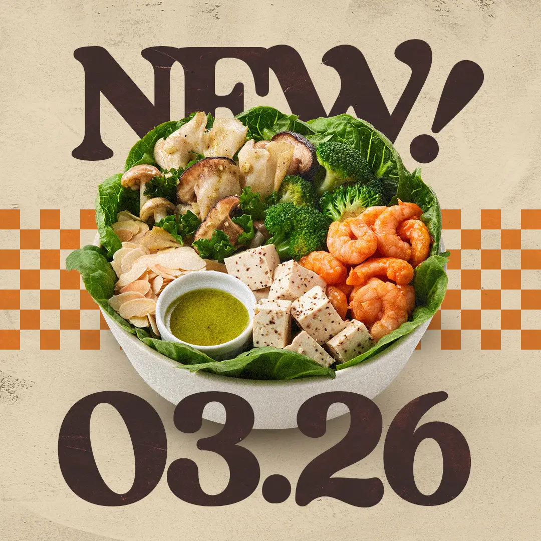 ロメインレタス、グリルドシュリンプ、スプリングマッシュルーム、スパイシーブロッコリ、アーモンド、ロースト豆腐、バジルオニオンドレッシング